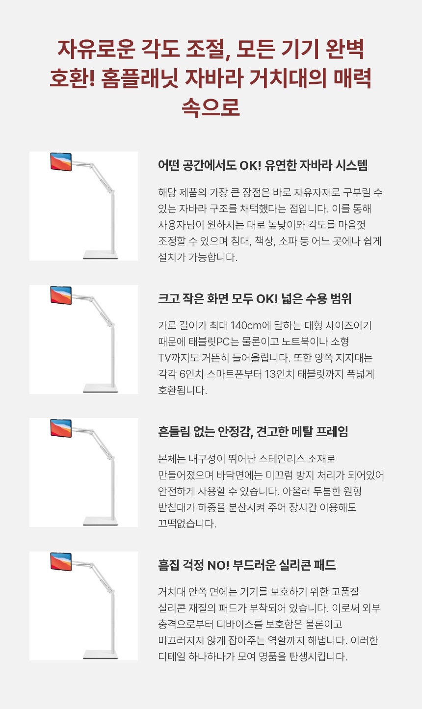 이 제품은 홈플래닛 140cm 자바라 스탠드로, 스마트폰과 태블릿 모두 거치할 수 있는 대형 스탠드형 거치대입니다.